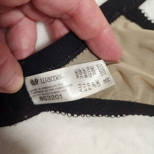 Gorgeous Wacoal black lace bra in size 32DDD. This bra is in excellent condition and features delicate lace detailing that adds a touch of elegance and sophistication. The Wacoal brand is known for its quality and comfortable fit, making this bra a must-have addition to your lingerie collection. The bra is designed to provide excellent support and shape, ensuring a flattering silhouette. Perfect for everyday wear or special occasions, this black lace bra will make you feel confident and beautiful.