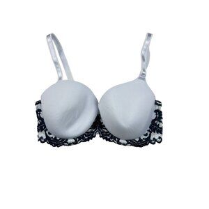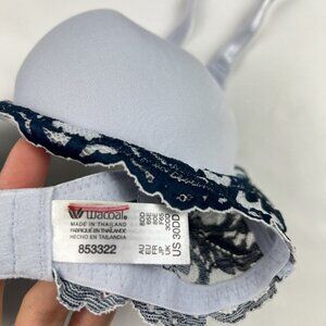 Wacoal Blue Lace Trim Instant Icon Underwire T-Shirt Bra. New without tags, never worn. Brand tag crossed out. Arctic ice/titan. Romantic, feminine everyday bra. Mid coverage two way stretch foam cups. Cross dyed scroll lace frame and back band. Adjustable satin straps. Hook eye closure. Nylon lycra spandex blend. Size 30DD. Retail: $68. (872)