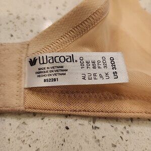 This is a Wacoal bra in size 32DD, designed in a nude beige color. It features a wireless underwire type for comfortable wear and is lined for added support. The style number is 852281, combining both functionality and fashion in a versatile piece of intimate apparel.