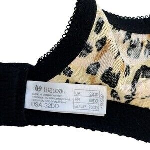 Women's Wacoal Awareness Full Figure Seamless Underwire Bra in animal print pattern, size 32DD. In excellent condition with minimal wear (small marking on inside of one cup as shown in photo, not visible from outside & no impact to wear). Super fun colorway; black & gold cheetah / leopard print! Lily / leaf pattern woven into jacquard fabric and beaded detail at center gore. Beautiful seamless, unpadded stretch cups for shaping with superb comfort and support. Leotard back with padded straps that are designed to stay in place. Back closure has 3 rows of 2 hooks. Style 855167.