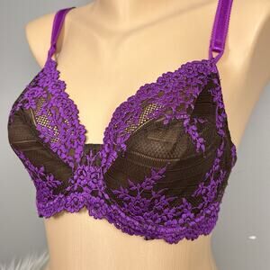 Listed is a Wacoal Embrace Lace bra, size 34DD, unlined cup, underwire, style 65191. Brown and purple contrasting lace pattern.