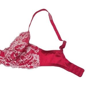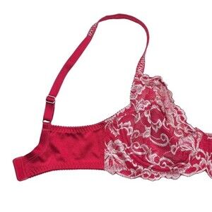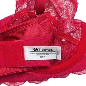 Women's Wacoal Lost in Lace Underwire Bra, size 32D. In excellent condition with minimal visible wear! Beautiful red color with cream embroidery & lace detail on cups with coordinating cream detail on straps. Hidden stretch lace band at top of cups for a beautiful fit that conforms to your shape. Lace on cups has scalloped edges. Straps are half adjustable at back. Back closure has three rows of two hooks each. Style 65769.
