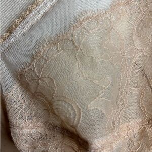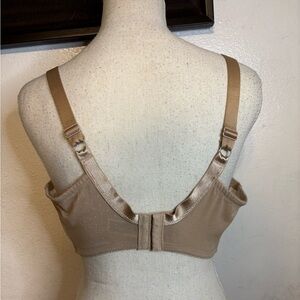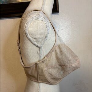 Chic Wacoal full figure underwire bra with intricate lace and bow detail. Soft tan hue. Size 38G excellent condition.