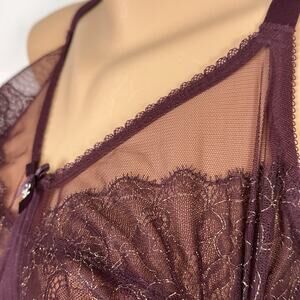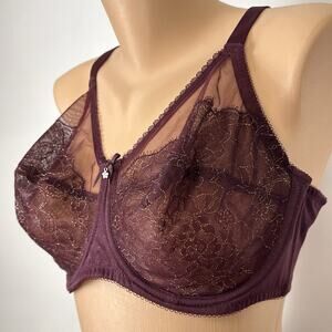 Listed is a Wacoal Retro Chic bra, burgundy, unlined cup. Golden floral pattern on cup. Mostly sheer cup. Style 855186. Back closure. Adjustable straps.