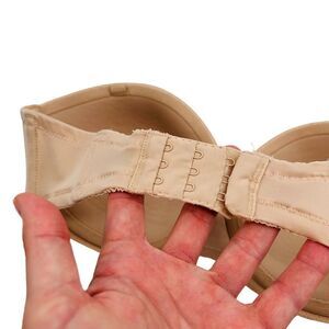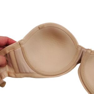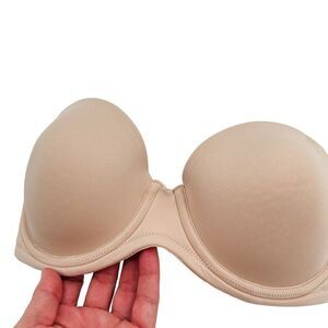 Wacoal red carpet beige underwire lined strapless bra size 30DD. Excellent preowned condition tabs to add straps (straps not included)