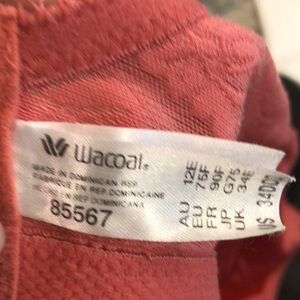 Wacoal underwire bra with lightly lined lace cups and padded shoulder adjustable straps. Breast cancer awareness label on back strap. Back strap has 3 hook and eyes for closure. Pre-owned and in very good condition. No stains or holes. Size 34DDD