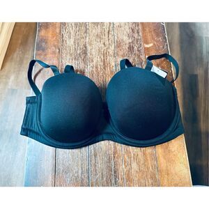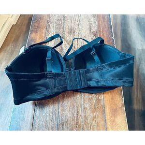 Size 34DDD | Black | 91% Nylon, 9% Spandex | Full busted strapless underwire bra | Smooth seamless fabric over stretch foam cups | Silicone strip along the top and bottom edge helps hold this strapless underwire bra in place | Hidden stays anchor and stabilize sides and back of this strapless underwire bra | Converts to traditional, halter, crisscross, and one-shoulder styles with a three hook and eye back closure