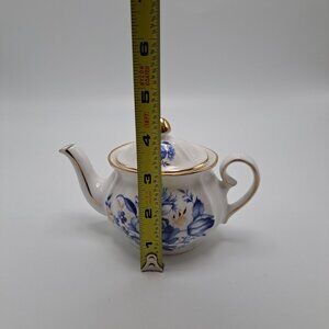 Elegant teapot with intricate blue floral design and gold trim. Perfect for tea parties or as a decorative piece.