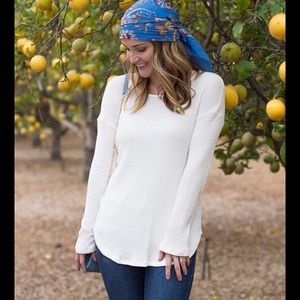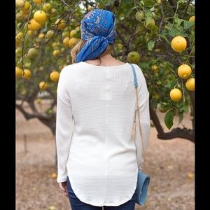 Open neckline with curved hemline. Slightly oversized for a relaxed look. The length is perfect for layering. Super soft. 95% rayon 5% spandex. Creamy ivory color. NWT