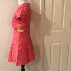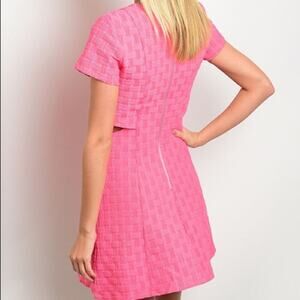 Pink waffle dress with zip up back and side cut outs. Necklace not included. 65% polyester / 30% cotton / 5% spandex.