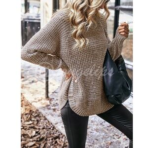 Waffle Knit Khaki Long Sleeve Sweater Turtleneck