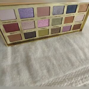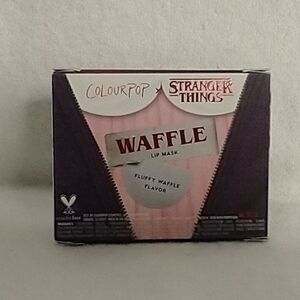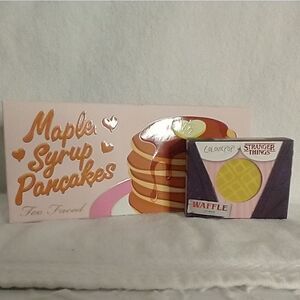 Too Faced Maple Syrup Pancakes eyeshadow palette. 18 pan palette is a mix of mattes and glitters/shimmers. Heavy cardboard packaging with a mirror. Smells slightly like syrup. Also included is Colour Pop x Stranger Things Waffle Lip Mask. Lip Mask smells heavily like buttery syrup. packaging says it tastes like it too but cannot confirm-did not taste. Plastic packaging inside cardboard outer packaging. All in original packaging. Taken out only for inspection and photos. No issues. Smoke free/Dog friendly home.
