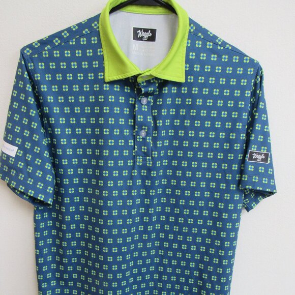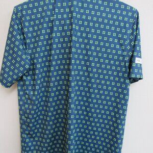 Waggle blue/green geometric all over print short-sleeve golf polo shirt. Size medium. 19.5" armpit to armpit and 29" top of collar to bottom of hem. Very nice condition. 4949