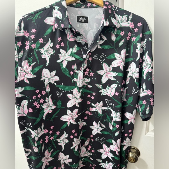 Waggle Men's Polo Shirt, featuring a vibrant floral design in black and pink. Ideal for casual outings, this shirt offers both style and comfort. Only worn once.