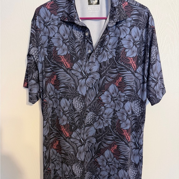 Stylish floral polo with black and gray hues. Features a comfortable fit and elegant design.
