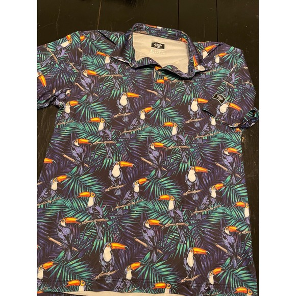 Keywords: Waggle golf, tropical print, toucan shirt, palm leaf, short sleeve polo, men's golf apparel, Hawaiian style, vacation wear, bold pattern, summer shirt, breathable fabric, performance polo