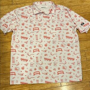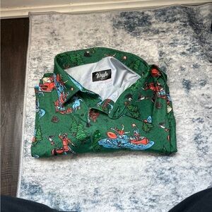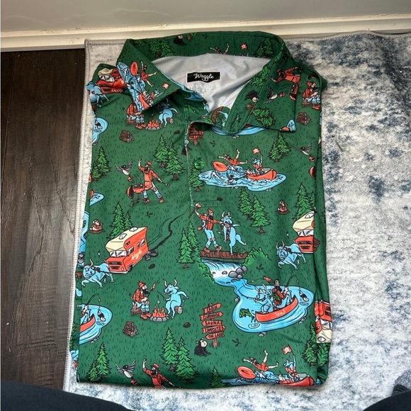 The shirt is a Waggle Golf Men's Off The Grid Polo, also known as the Paul Bunyan and Babe the Blue Ox polo, created in collaboration with artist Adam Turman. The green polo features a pattern of various outdoor and camping activities, including kayaking, fishing, and a red car pulling a camper. 2XL have other styles for sale to bundle