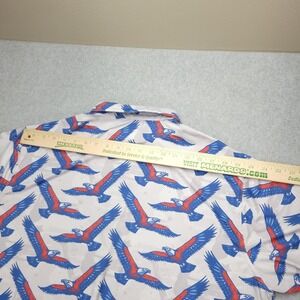 Color: Light base color with bold allover blue and red flying eagle graphic print and subtle tonal background pattern.