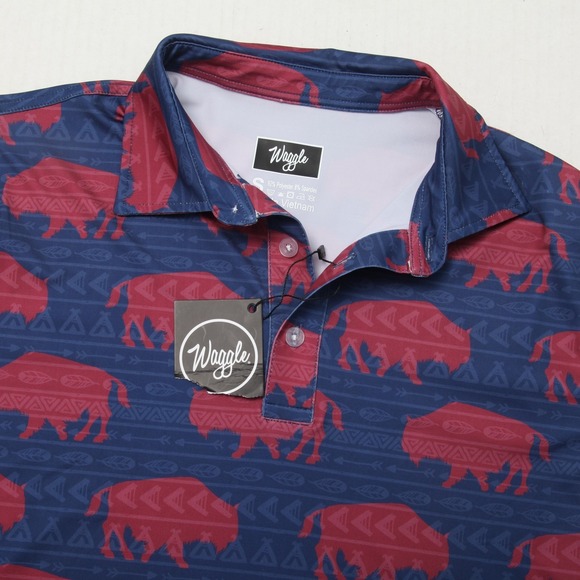 New Waggle golf polo shirt with factory hang tag attached. Fabric, seams, collar, sleeves, and buttons are clean and intact with no stains, snags, or damage, and colors remain crisp with light wrinkling from storage only. Shirt only is included; original retail box or additional packaging is not included beyond the storage poly bag shown.