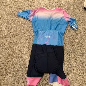 So comfortable! Kafit short sleeve/ shorts skin suit used for professional indoor (zwift) racing only a handful of times. Fits like a small.