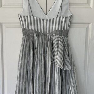 "Breezy and light, the Sebastian dress is made for all your warm weather invites to showers and weddings. The fit-and-flare dress is fabricated in striped cotton with woven metallic thread. With careful details such as the check-patterned waistband and the double spaghetti strap, the Sebastian dress is the ultimate in summer party ease."