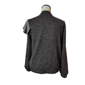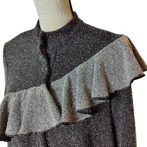 Wai Ming Studio women's Bomber style knit jacket with ruffle detail. Snap closure. Elastic at waist and cuffs. Really pretty diagonal ruffle across the front. Made of light weight Italian knit boucle. Fully lined. Made in the USA.