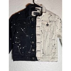 Unique color block denim jacket featuring a striking black and white design with a splatter paint effect. This eye-catching jacket is perfect for adding an edgy and artistic touch to any outfit. It features a classic denim jacket silhouette with button-down closure, a collared neckline, and functional pockets. The distinctive color blocking and splatter details make it a standout piece for children who love to express their individuality. This jacket is well-suited for casual outings, school events, or creative playdates.