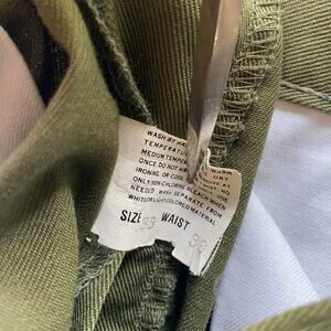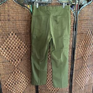 Olive green work pants. With pockets in front, back, and on the thighs. Snap button pocket closures. Zipper and button closure at waist. Straight leg. The legs have been hemmed from their original length. There are a few color fade spots on the back pocket (pictured) they do not impact wearability or garment structure. Green carpenter pants. Boy Scouts of America uniform.