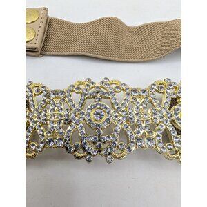Waist Belt Women's M/L Metal Gold Rhinestone Elastic Snap Closure Tan Y2K glam