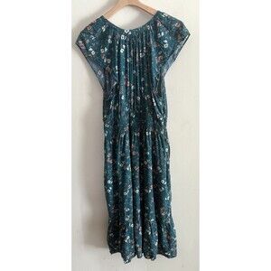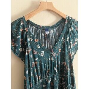 The product is a XL green floral midi dress from Old Navy, featuring a V-neckline, short flutter sleeves, and a pullover closure. Made from a combination of rayon and cotton, this A-line dress is perfect for casual occasions during the summer and spring seasons. The smocked detail adds a touch of charm to this stylish and easy-to-care-for piece that is machine washable for added convenience.