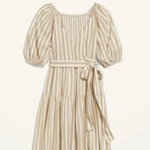 Waist-Defined Striped Tie-Belt Midi Wrap Dress for Women - Natural Stripe XS