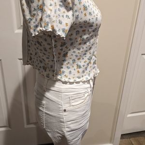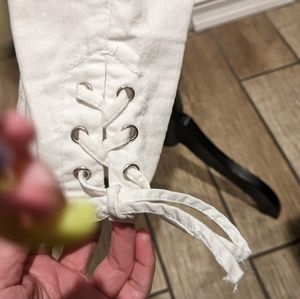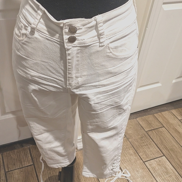 This is a really cute. white capris with laces on the bottom it would be really cute with a tank top or a crop top or rock tea pair of sandals and little hat and off you go. perfect for the summer. If you have any questions or would like to make it off for let me know.