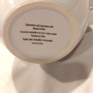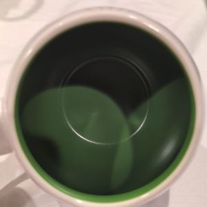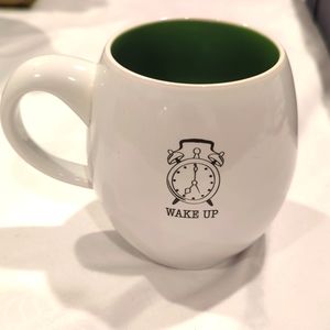 Mug with "Wake Up" printed on both sides as well as an alarm clock. White with black writing and green inside. Rounded. Larger than average mug but not huge. Never used. No defects.
