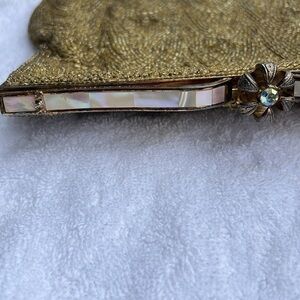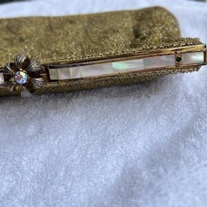 Of the frame is encrusted with mother of pearl. This bag did one have a chain handle, but that was very long ago and is now used as a clutch. Goldtone satin lining does show some ink and makeup spotting. No odors. Very roomy. 8” x 6.25”