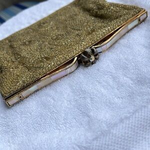 Walborg Vintage Hand Beaded Micobead Seed Gold Beads Snap Clutch Bag