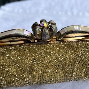 This is a beautiful Walborg Vintage Hand Beaded Micobead Seed Gold Beads Snap Clutch Bag. Made in Japan. Almost all