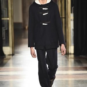 Wales Bonner Soul Duffle Coat from Autumn Winter 2017 collection named "SPIRITUALS II" look . This Classic Duffle Coat is crafted from soft pure wool in a fleece weave, cut in a short silhouette and features two large patch pockets and central large white toggle fastening. Made in England
