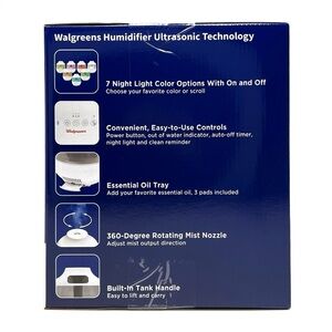Description: Humidifier with ultrasonic technology | Visible cool mist | Auto shut-off | Whisper quiet | Clean tank technology | 7-color night light | No filter needed | Essential oil tray | Up to 25 hours run time