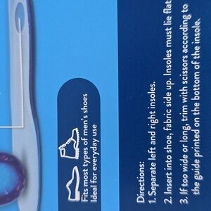 1. Separate left and right insoles. 2. Insert into shoe, fabric side up. Insoles must lie flat. 3. If too wide or long, trim with scissors according to the guide printed on the bottom of the insole. ©2023 Walgreen Co.