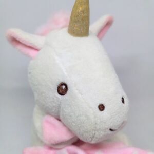 Walgreens, Moon and Stars unicorn lovey. White unicorn with pink mane, holding a square lovey blanket. Blanket has pink & white stars on one side, and solid pink minky dots on the reverse. Has embroidered eyes and mouth. Approximate measurements are: Unicorn-7" tall, Lovey is 9" x 9". Item is in excellent pre-owned condition, with little to no wear. Item number:296794.
