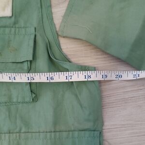 Stay organized while wearing something REALLY kool on your next fly fishing exersion! This vintage cotton lightweight WALKER will do just that. The material has no holes or frays and zippers are in good working order. Pockets snap shut. The vest has a few little stains (see pic) and a little faded but only adds to its history as a great working piece of sporting gear. Featuring multiple pockets, feathered fishing flies, and additional zip side pocket. Also, great for the ladies! 18" pit to pit. 22" inside shoulder to hem.