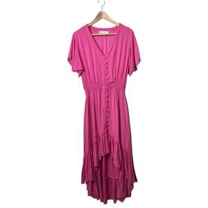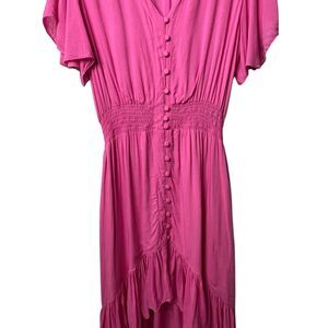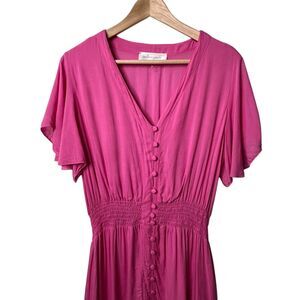 Walker and Wade Ava Dress in Hot Pink, Smocked Elastic Waistband, V-Neckline, Slight High-Low Hem, Flutter Sleeves, Functional Covered Buttons, 100% Soft Organic Rayon