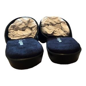 A low wedge heel adds a trendy touch to these leather slides featuring a single upper strap and a textured footbed with a soft lining.