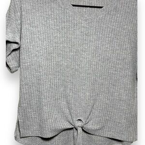 Stylish gray top with a V-neck. Features a tie front detail. Perfect for casual wear.