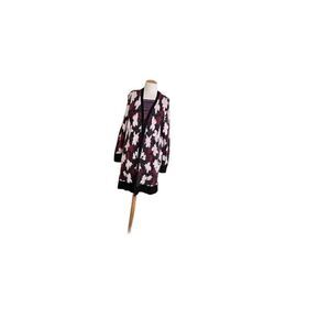 Warm sweater, driving coat, or Cardigan. Rayon/Acrylic mix. Longer length with slits on the sides are ease and movement. Beautiful with burgundy bellbottoms or a faux leather leggings. In excellent condition no pilling. Nice print some thing outside of animal prints. Machine wash line dry air fluff. In great condition.