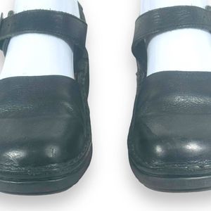 Walking Co Leather Ankle Strap Buckle Slip On Close Toe Flat Shoes Black Size 6