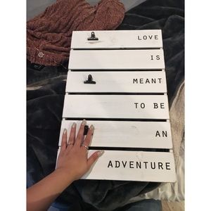 Rustic wood sign with “Love is meant to be an adventure” on it. Also has clips down the left side so you can place pictures and things. NWT!