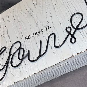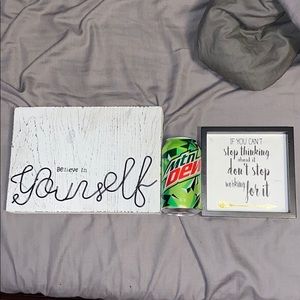 2 wall art signs. I used a mtn dew can for reference of size! If you would like 1 of them and not both, comment so i can make a new listing for that item! The little one has some black scuffs! The big one using metal wiring for the “yourself”!