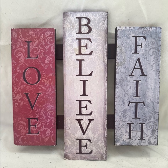 “Love, Believe, Faith” Hanging Wall Decor. Some wear & tear, bought from a yard sale.