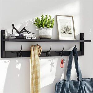 Wall Mounted Shelf With Hooks Entryway Organizer Rack Black Wood Hanging Shelf